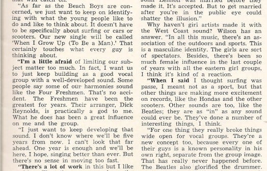 Yet at the same time, Brian continued to accept the unshakable premise that underlay all Beach Boys music to date: the songs would continue to be tailored for the teenage sensibility. “As far as the Beach Boys are concerned,” he said, “we just want to keep on identifying with what the young people like to do and like to think about.” Brian then asserted that the band’s new single, “When I Grow Up (To Be a Man),” “certainly touches what every guy is thinking about.”